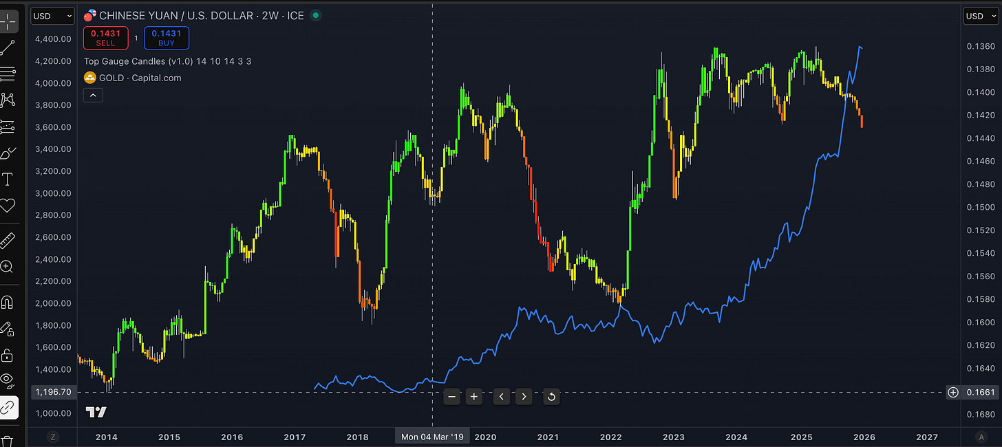 In the following chart you have CNY/USD inverted v’s Gold USD