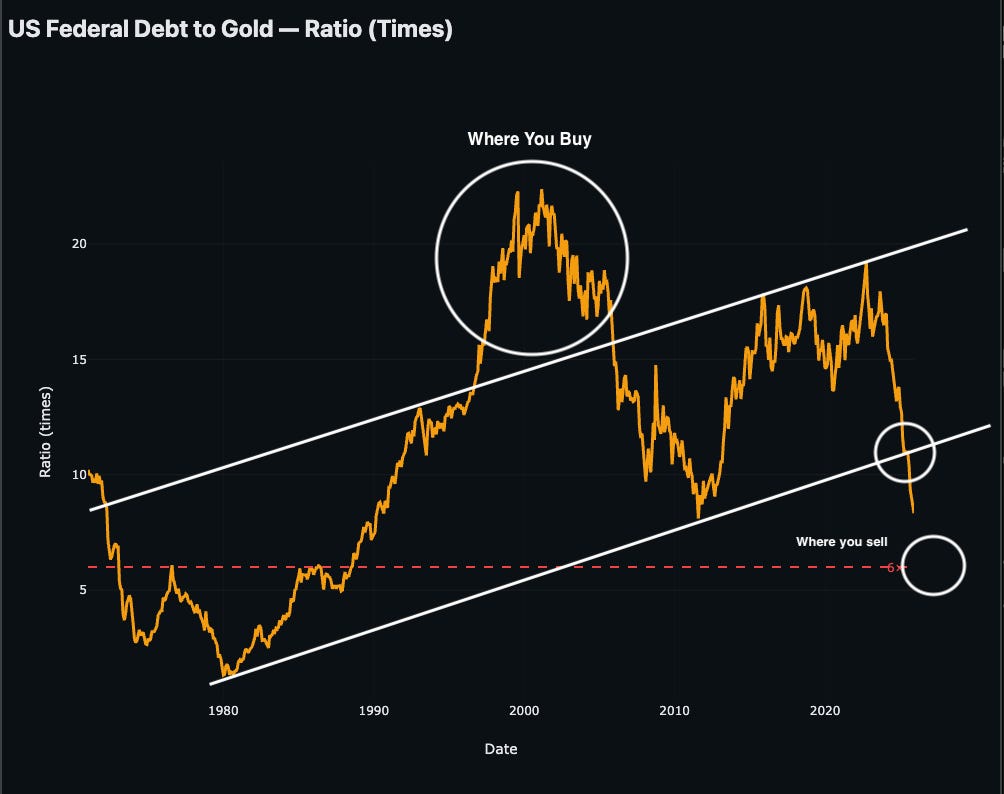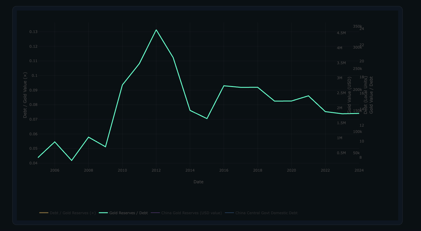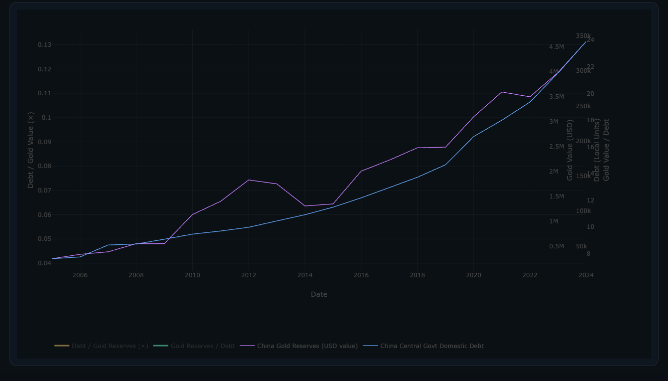 Now we look at China Government Debt / Gold (ratio), you’ll notice they’ve over the years since the GFC attempted to contain a trend in a specific range without allow it to surpass (come out of that trend, during Covid that broke — first down then up violently, to which they’ve in 2022 commenced a debasement of the Debt in Yuan (CNY - onshore) by buying up gold