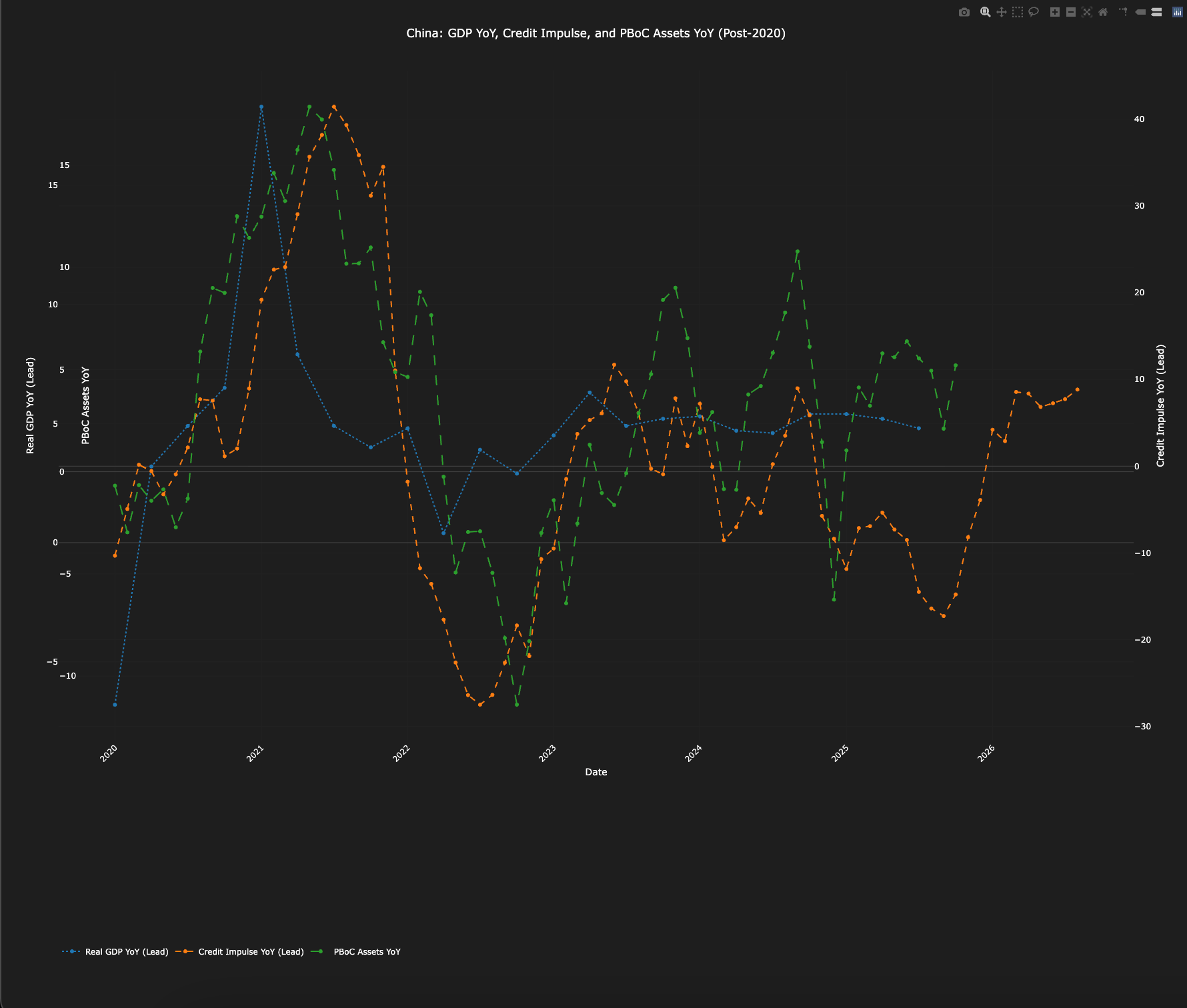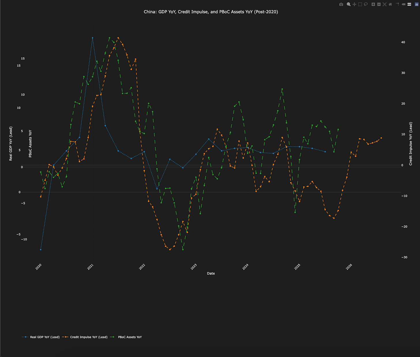 In the following chart you have Chinese GDP (YoY) vs PBoC Assets (YoY) with the Credit Impulses (liquidity injections) leading.