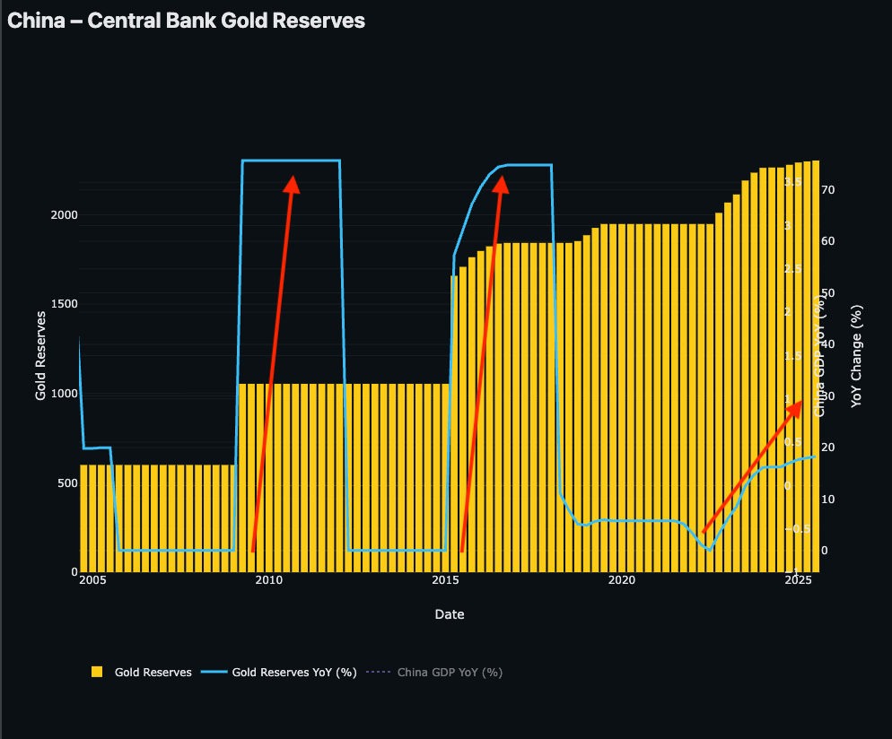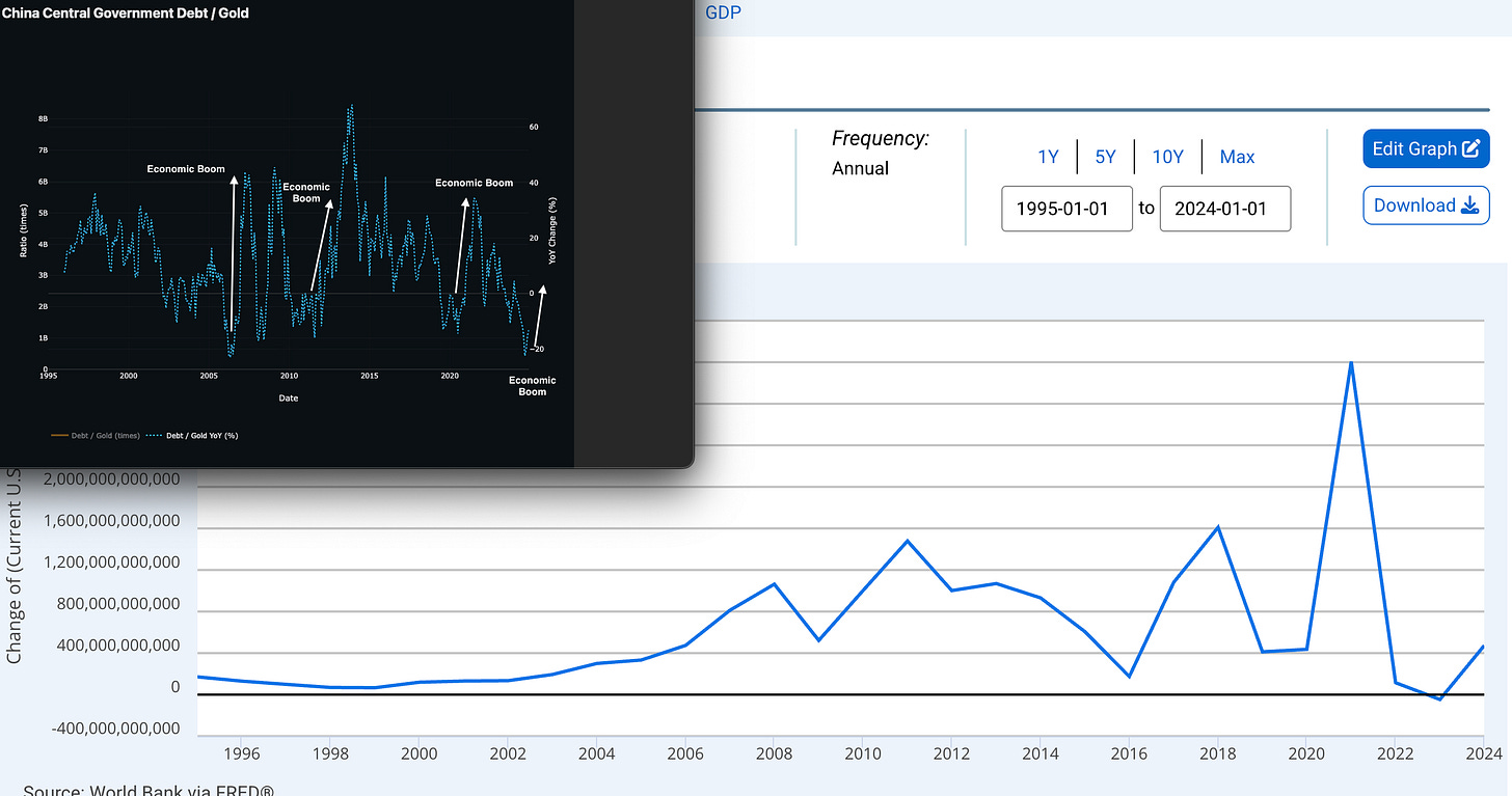 Here we have China Central Bank Gold Reserves and the YoY% as you can see historically China buys Gold when it needs to debase its debt to revitalize its domestic economy or debase its debt - 2008, 2015, 2022.