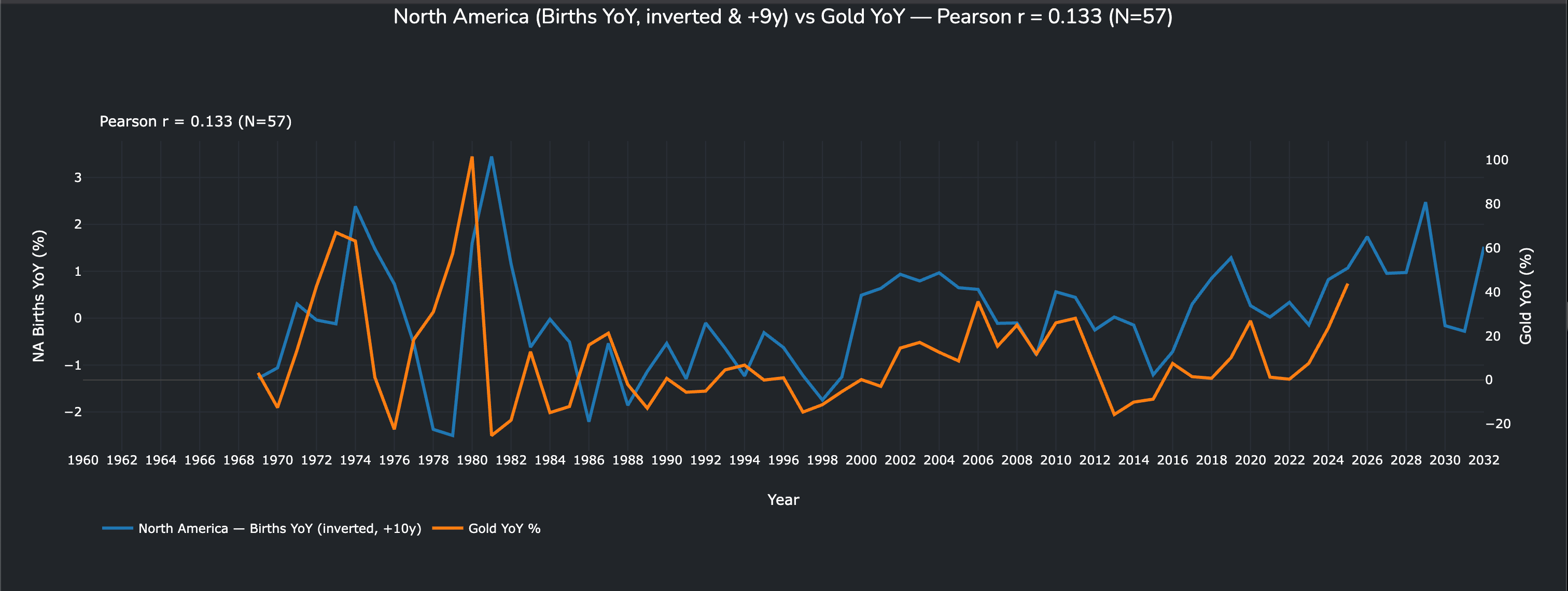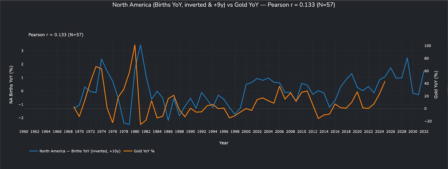 Which is following the demographics issue in the US i.e see the following article and apply to the US, or this article as similar all just playing out on different timespans, as you can see below NA (incudes Canada, Mexico) Births YoY inverted and shifted forward 9 Yrs vs Gold YoY.